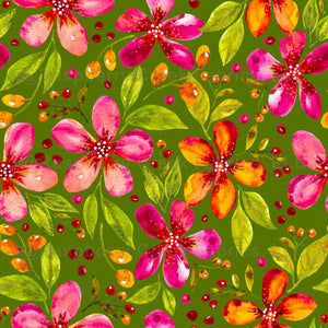 Magenta, Maroon, Pink, magenta and Marigold yellow watercolor floral with surrounding berry botanicals and bright green leaves on Green. Secondary Hero, Felicity Floral Collection. Spring, Summer, Home Decor, Fabric, Large Scale