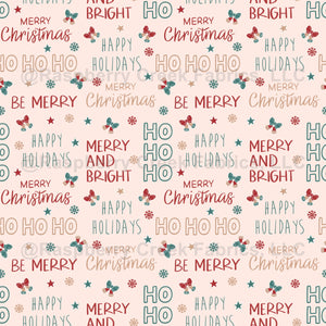 A festive pattern featuring Christmas and Holiday greetings in red and teal on brown. Perfect for holiday decor, DIY crafts and seasonal projects.