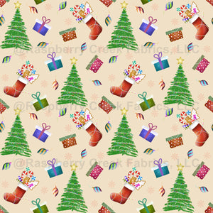 Cheerful Christmas pattern featuring decorated trees, stockings filled with treats and colourful gifts on brown background. Perfect for holiday decor