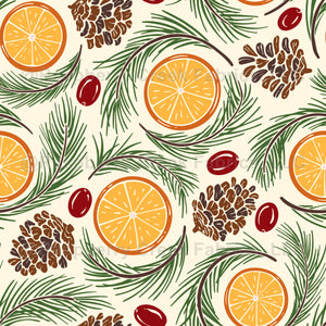 Dried Oranges and Cranberries mingle and flow with pine branches and pine cones for a festive feast for the eyes.