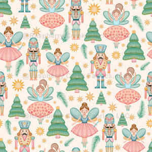 Festive watercolor Nutcracker design with fairies, toy soldiers, Christmas trees, and golden stars on a warm cream background