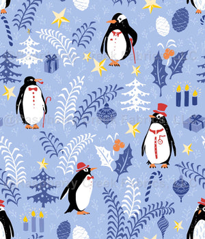 Festive, cute penguins for the nostalgic winter season in modern Scandinavian style. Dressed right for Christmas with a tailcoat and hat. Fresh, classic winter color palette.
