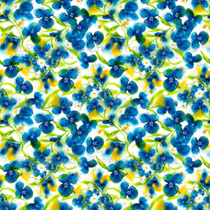 Watercolor pansies in blue with green botanicals and tiny white and yellow flowers. Romantic, washy modern floral, Victorian , French country, fabric, home decor, interior design. Medium Scale
