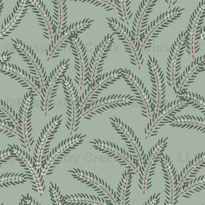 A modern, all-over leaf pattern featuring fir leaves on a cool, green grey coloured background. This pattern is also available in other colour-ways.