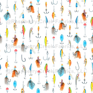 A vibrant pattern of watercolor fishing lures, bursting with color and charm—perfect for nature lovers and angling enthusiasts alike.