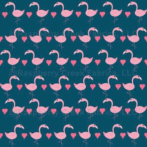 A parade of hand drawn flamingos marching across a deep ocean colored background with pink hearts.