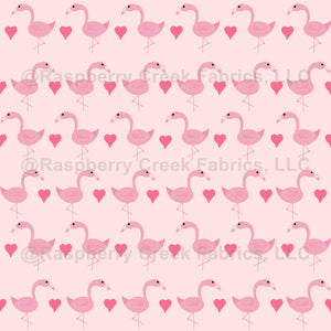 A parade of flamingos marching across a white background with pink hearts.