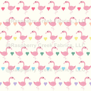A parade of flamingos marching across a white background with soft rainbow colored hearts.