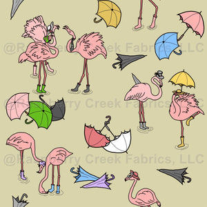 It's the perfect weather for these cute little flamingos with their colorful rubber boots and umbrellas on gold khaki.