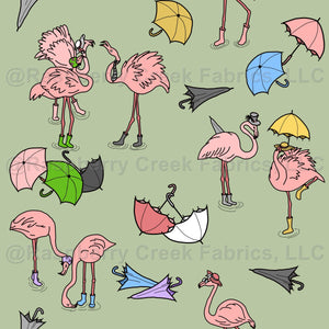 It's the perfect weather for these cute little flamingos with their colorful rubber boots and umbrellas on sage green.