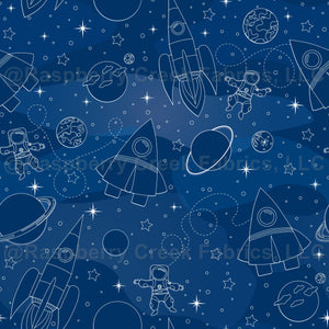 Floating in Space, Space Man, Rockets, Planets, Blue and White Rockets and Astronauts by Forever Lucy