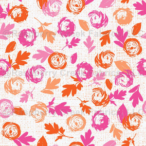 Scattered rose buds in vibrant orange, peach and pink on a dotted white background.