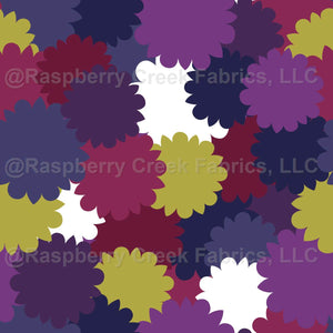 Large floral silhouettes scattered in deep, bold jewel tones: deep pink, wine red, dark royal blue, steel blue, bright and dark purple, plus acid green, white, and black. Largest flowers are 2.5” wide, design is 8” repeat.