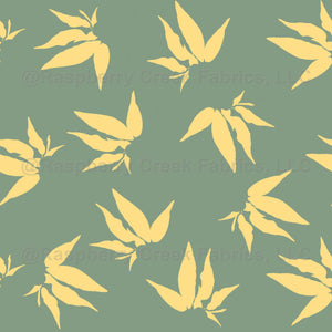 Leaf silhouettes in a repeating, seamless pattern create a nature-inspired design. The background color is mint leagreen, while the leaves are depicted in a contrasting shade of yellow.