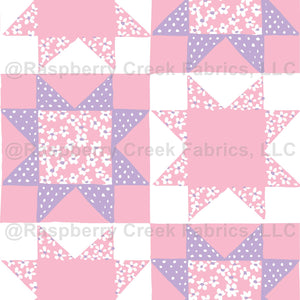 This design features hand drawn quilt stars with little flowers in them in a purple, pink and white color scheme. This would be cute for a cheater quilt or other projects. Please Note: This design is hand drawn so it is a little more organic in shape than perfectly crisp edges.