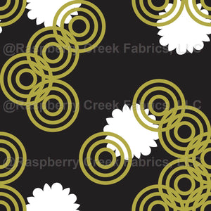 Large concentric circular motifs and flower outlines in acid green and white, scattered on a black background. Motifs are 2” wide, repeat is 8”.