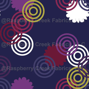 Large concentric circular motifs and flower outlines in deep, bold jewel tones scattered on a white background. Motifs are 2” wide, repeat is 8”.