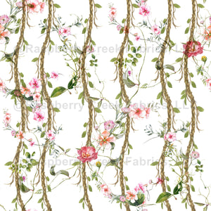 Flower Collection: Pink roses, petunias and tea roses climb on tan vines with green leaves and ivy all in watercolor on white background.