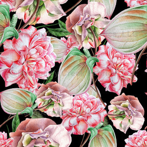 Flower Collection: Pink tropical elegant flowers with exotic two-tone green leaves all on a black background.