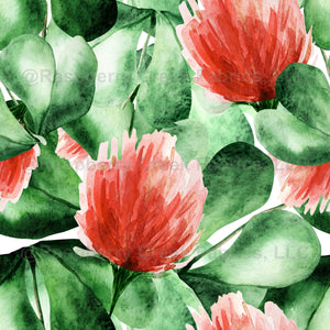 Flower Collection: Red clover jungle watercolor wallpaper with shiny green leaves on a white background.