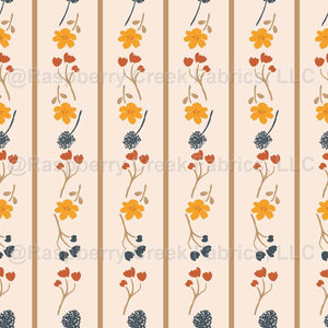 Flower Patch Stripe Autumn; Brown stripes with small rusty orange, gold, and blue flowers in a vertical pattern on a cream background; romantic, feminine floral pattern