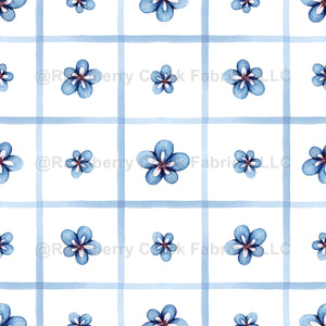 Watercolor Hand Drawn Illustration of Blue Flowers and Soft Blue Narrow Stripes. Rustic Plaid, Check, Gingham