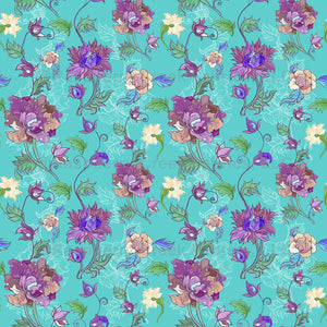 Flowers Collection: Fantasy floral with chrysanthemums in purple, lavender and tan hues with green leaves and an aqua blue background.