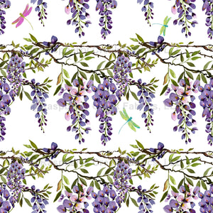 Flowers Collection: Watercolor wisteria floral on a trellis in purple, lavender, violet, green and dragonflies in pink and green with a white background.