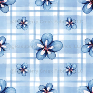 Watercolor Hand Drawn Illustration of Blue Flowers on Soft Blue Stripes. Rustic Plaid, Check, Gingham