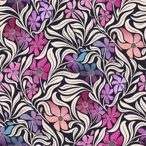 Multicoloured flowing flowers in shades of bright pink and purple on a Closed Shutter black.