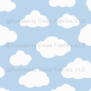 Fluffy wooly clouds on baby blue sky
