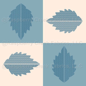 A calming, folk-inspired botanical grid design featuring hand-drawn leaves on a soft alternating cadet blue and cream checkerboard.