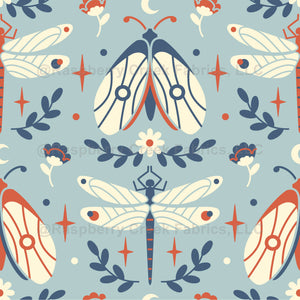 Folk style pattern. Bohemian moth and dragonfly. Muted spring garden aesthetic. Limited palette graphic