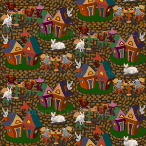 Perfect for fall and back to school, this whimsical design features rabbits,o'possums, squirrels, and pigeons enjoying tea time at tiny tables set on brown cobblestones. Quirky little colorful houses complete the design.