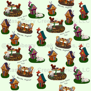 Perfect for fall and back to school, this whimsical design features rabbits,o'possums, squirrels, and pigeons enjoying tea time at tiny tables on a mint green background. Quirky little colorful houses complete the design.