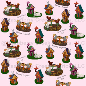 Perfect for fall and back to school, this whimsical design features rabbits,o'possums, squirrels, and pigeons enjoying tea time at tiny tables on a pale pink background. Quirky little colorful houses complete the design.