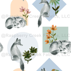 Cute watercolor woodland foxes are nestled under color block shapes, including arches, squares, and circles. Garden design