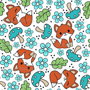 Fox Friends Mushrooms and Flowers Blue on White