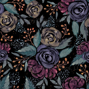 Francine is from an original modern floral on black paper using metallic watercolors. Fresh blooms and buds, roses and peonies in magenta, purple and yellow, surrounded by mint green leaves, and orange berries with aqua blue botanicals. Hero design for Francine Watercolor Floral Collection. Wallpaper, Fabric, home decor