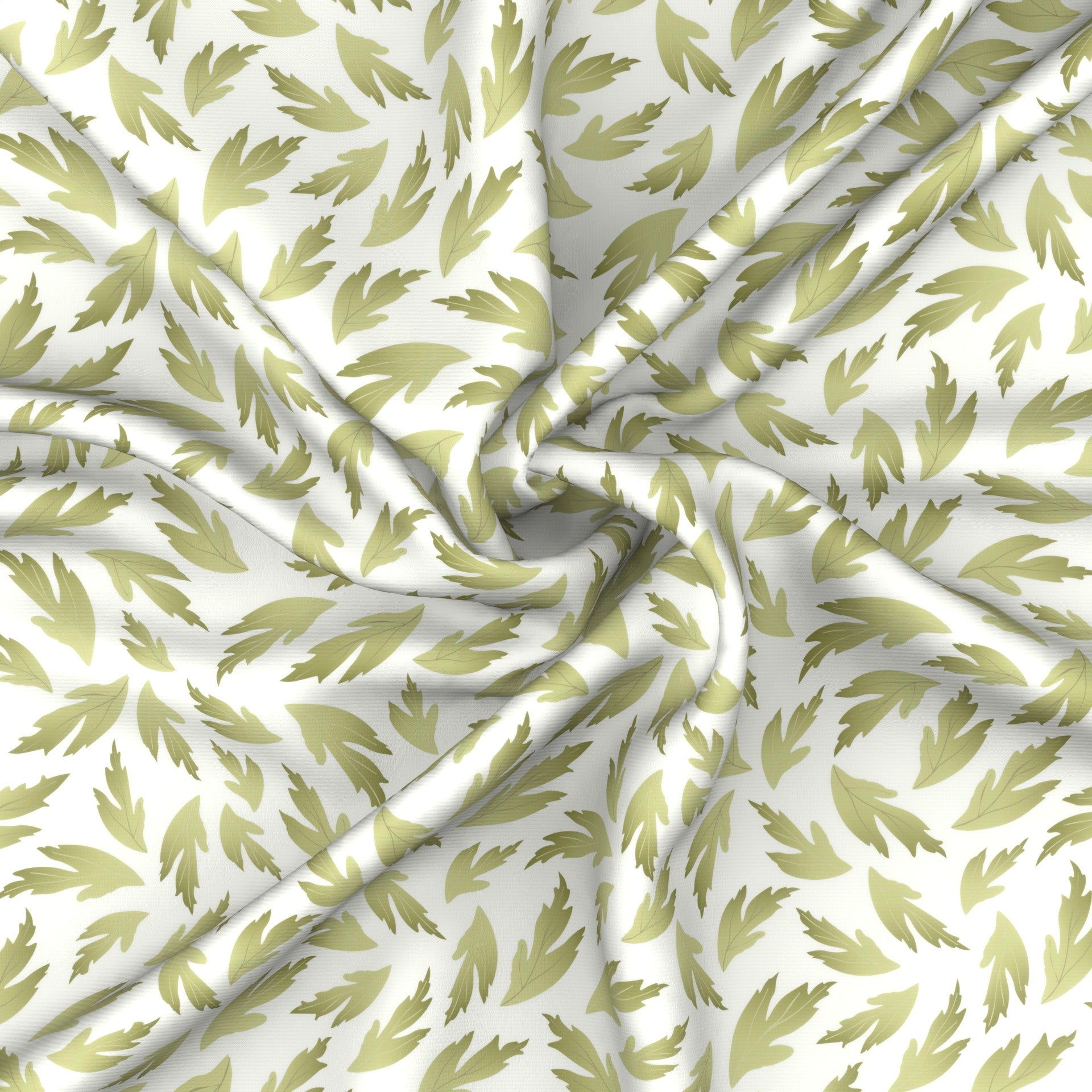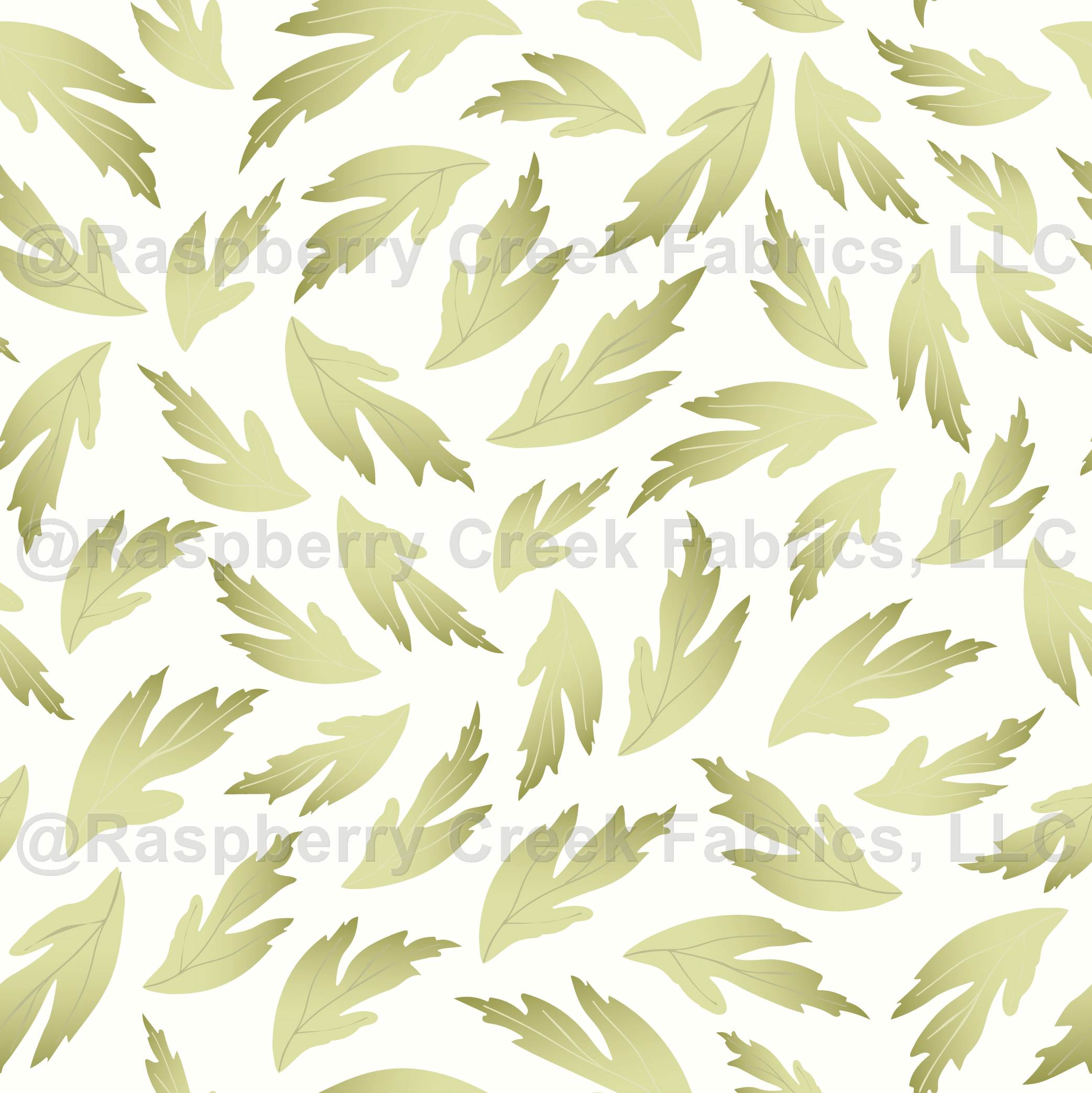 Multi-directional monochrome pattern with playfully tossed sage green buttercup flower leaves set on a solid off-white background. Matches the French Country Meadow patterns.