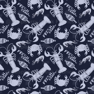 Main Lobster, crab, shrimp, bouys, nets, and hand-lettered "Fresh Catch" in Ice Blue tint on a Nautical Deep Navy Blue. Seafood, Picnic, Summer, Fish, restaurant, apron, tablecloth, fabric,Crab Boil