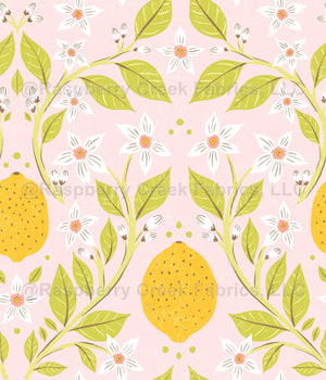 A delicate and cheerful symmetrical design of fresh yellow lemons surrounded by green leafy stems with white blooming lemon flowers on a soft pink background.