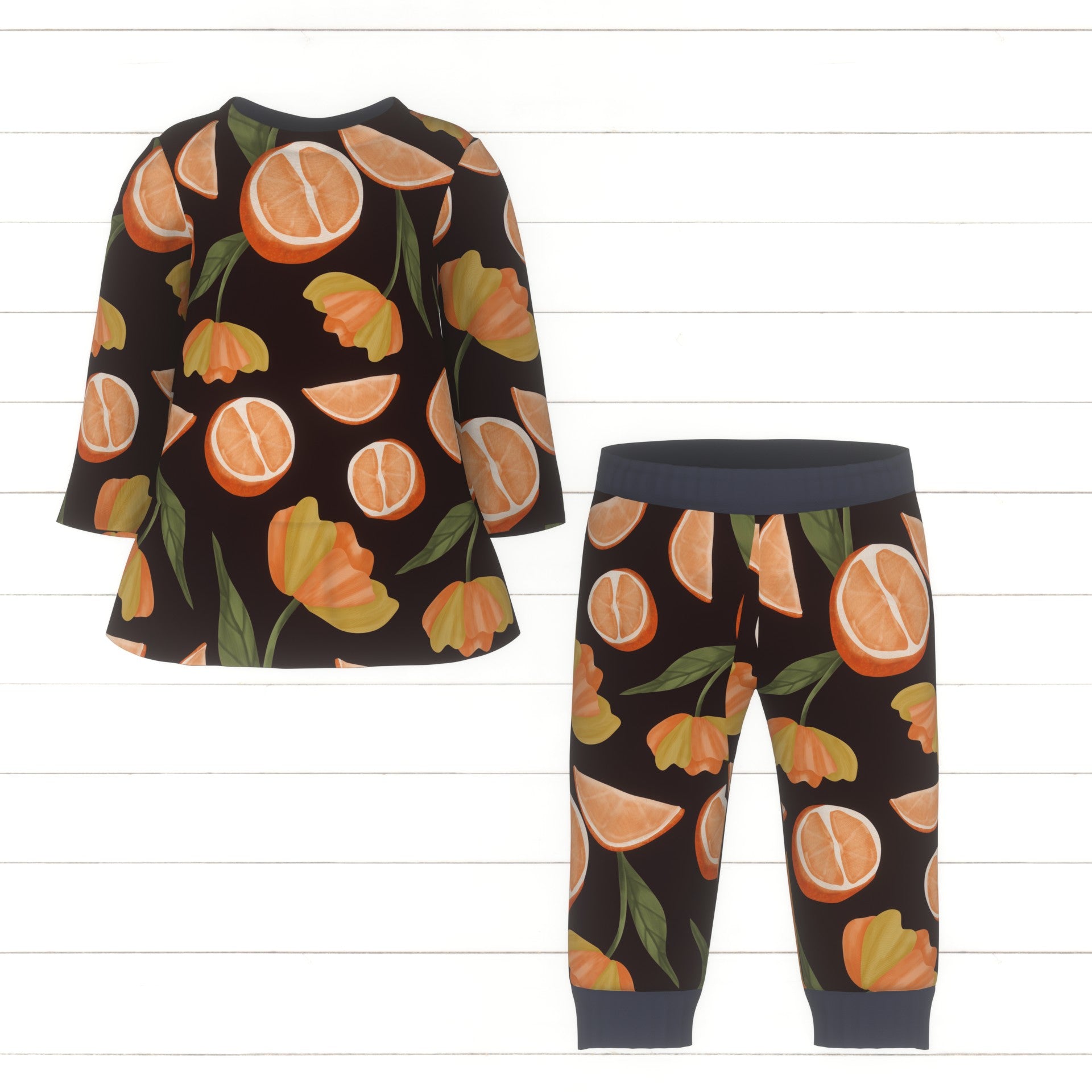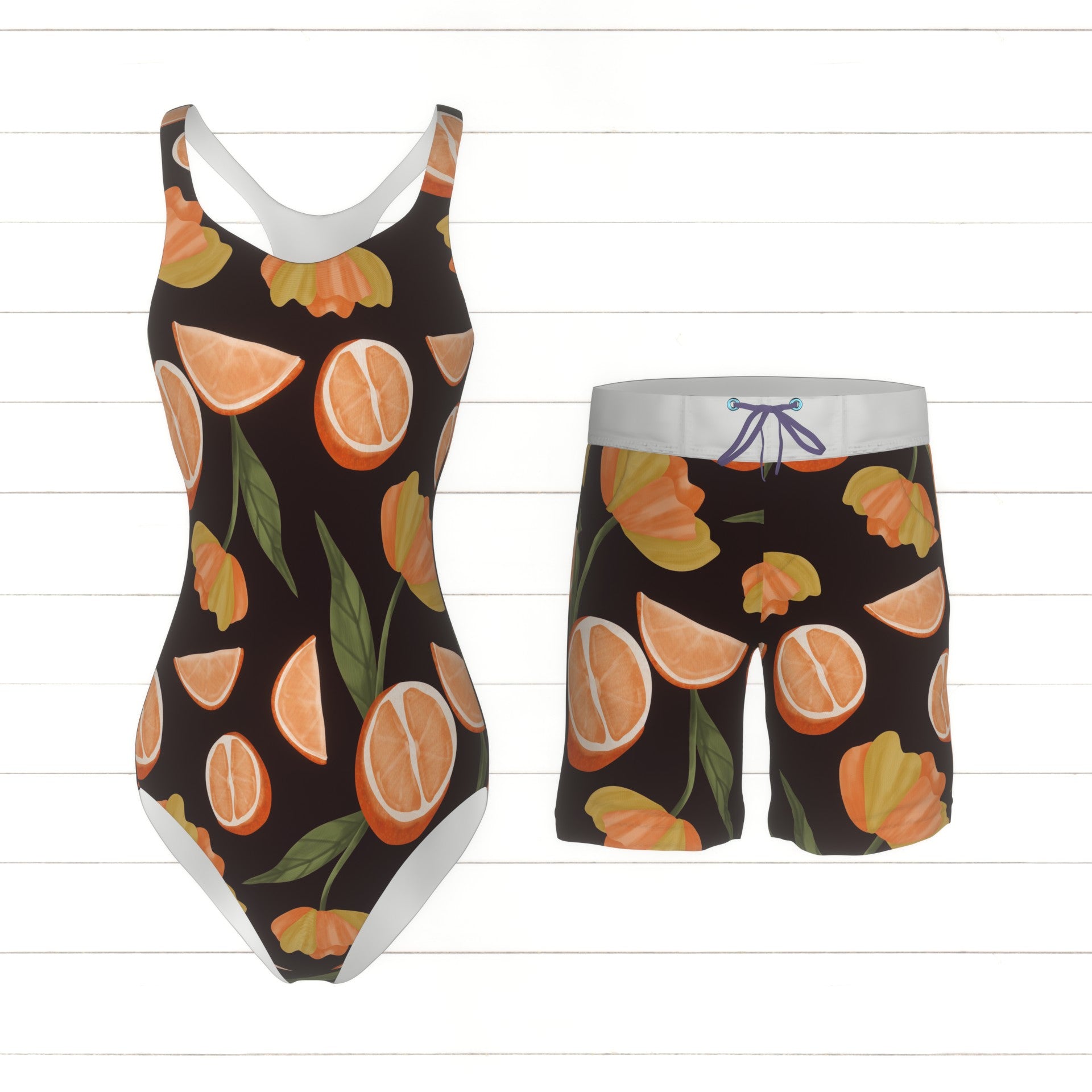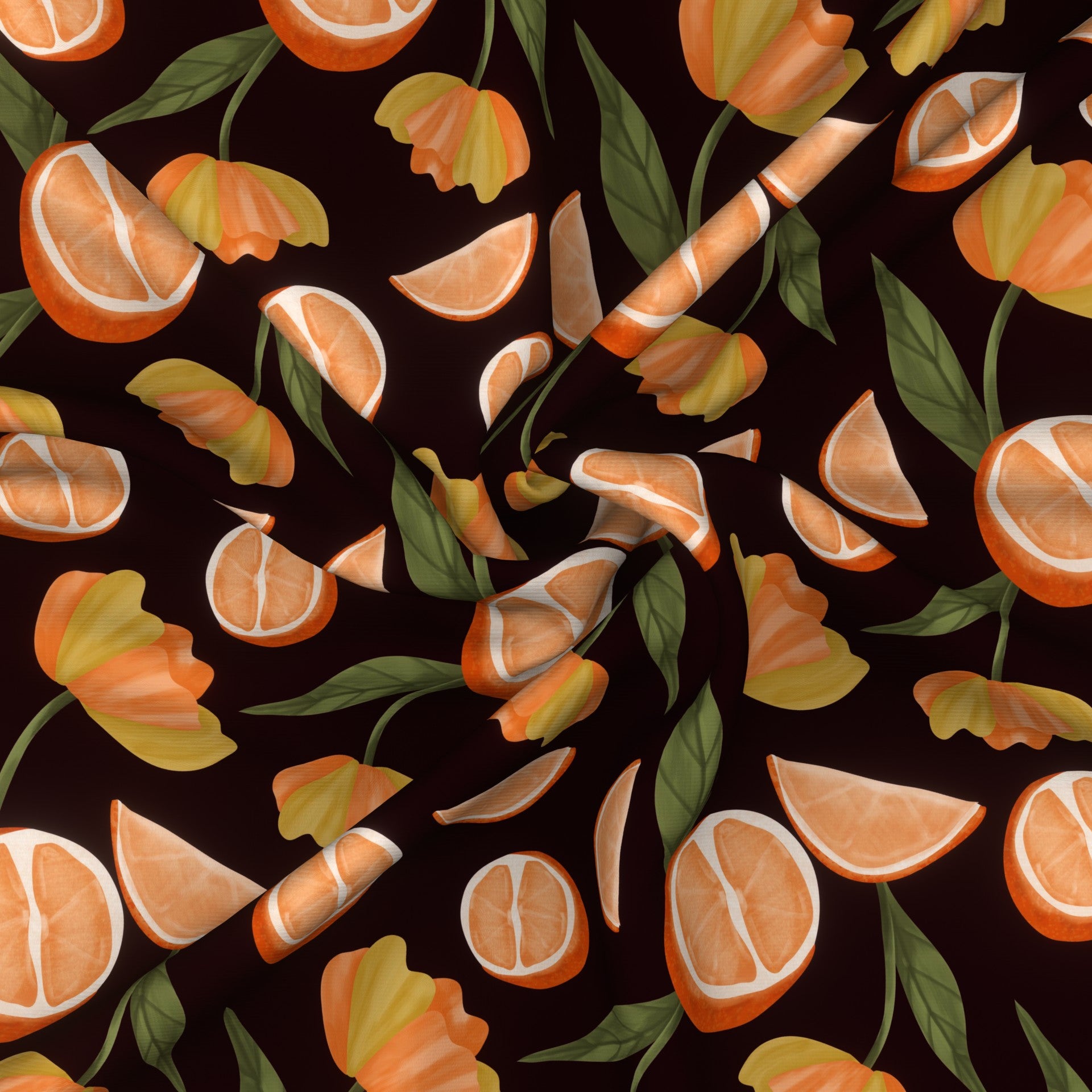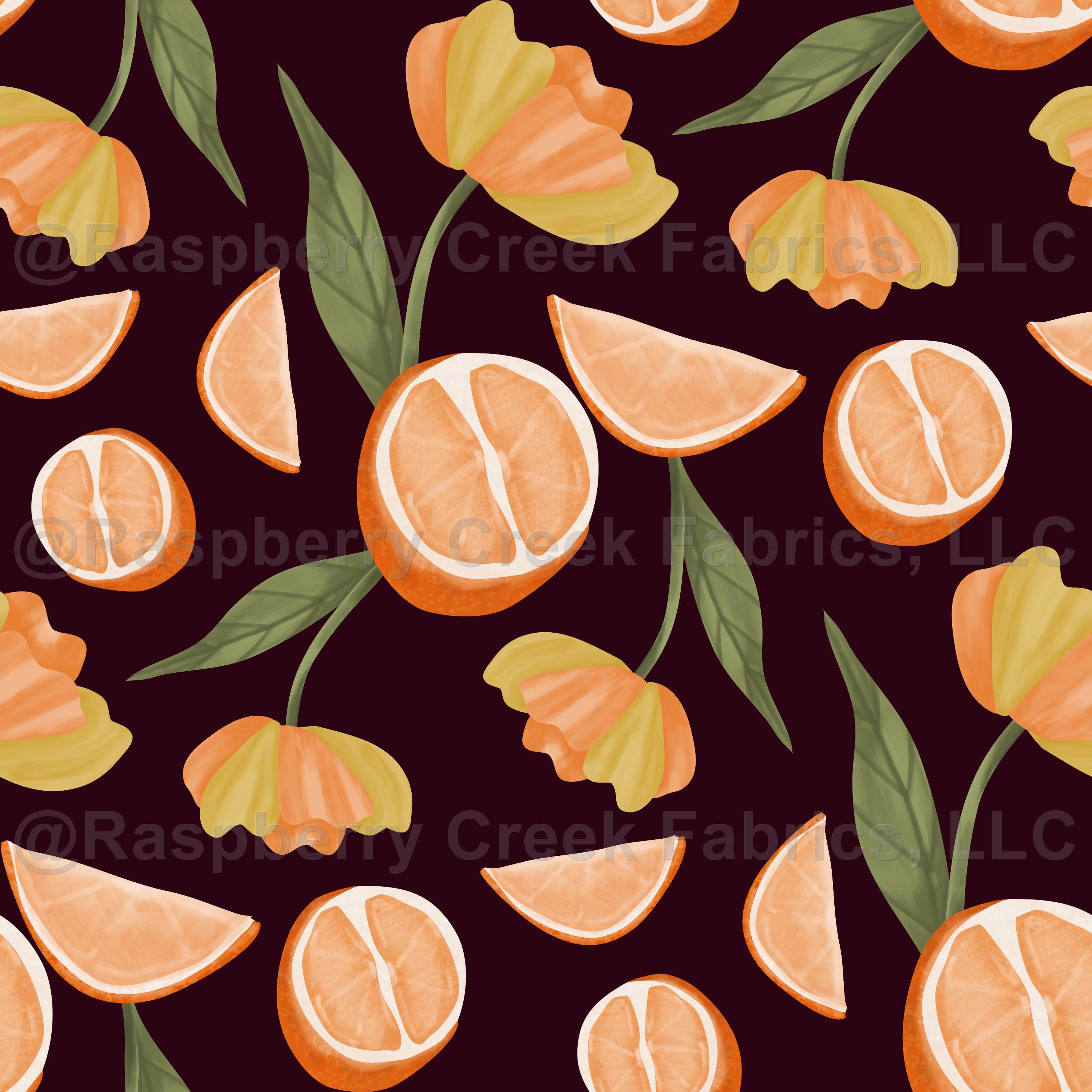 Fruit and floral orange slices and bright yellow and orange flowers with leaves on a dark purple-red background
