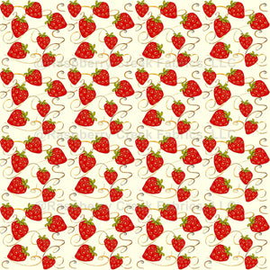 Fruit Collection: Red juicy strawberries on rich cream color with bands of curled gold straw on and around the tasty berries.