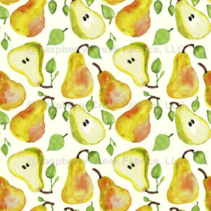 Fruit Collection: Watercolor of juicy ripe pears sliced in half with, black seeds, green leaves, brown stems on an ivory background.
