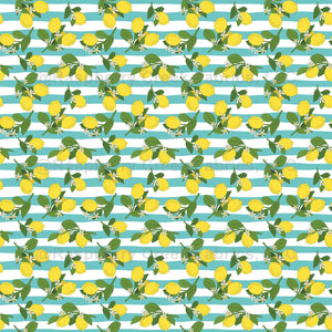 Fruit Collection: Yellow lemons with their white flowers and green leaves on an aqua blue striped background.
