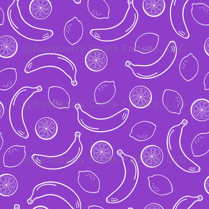 Cute, fun and adorable pattern with lemons, oranges and bananas on purple background. Modern and trendy, perfect for the fruit lover.