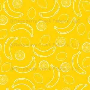 Cute, fun and adorable pattern with lemons, oranges and bananas on yellow background. Modern and trendy, perfect for the fruit lover.
