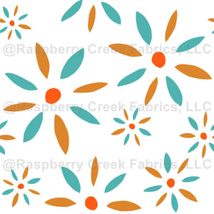 This fabulous mid century modern styled fabric features abstract flowers in turquoise blue and two shades of orange. This will make a colorful addition to your sewing or quilting project!