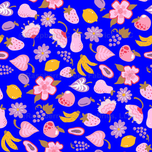 Funny and sweet fruits and flowers ditsy NON DIRECTIONAL on electric blue